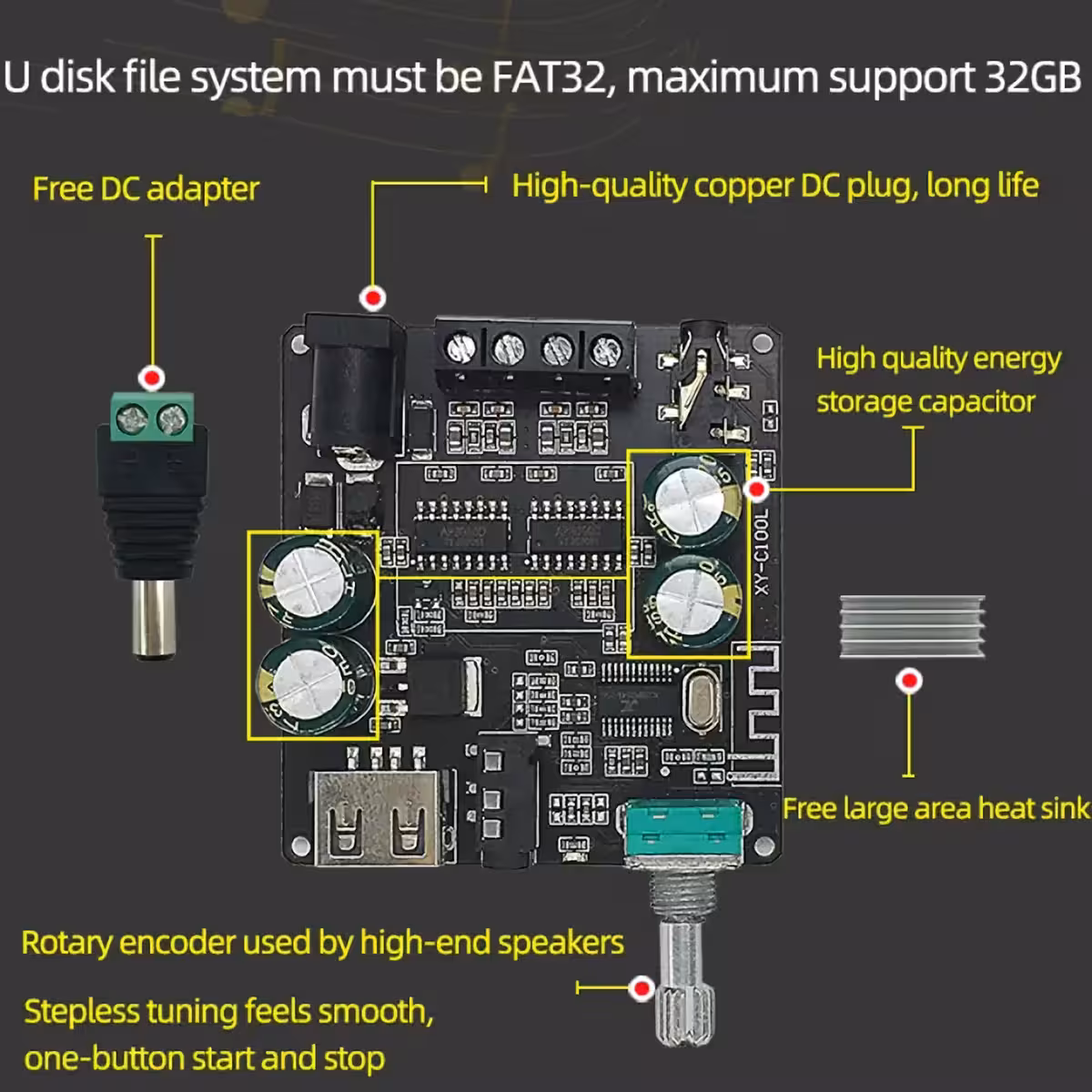 O amplificador estéreo Classe D fornece potência real de 2x100W RMS, estando equipado com botão rotativo tipo encoder e sistema de resfriamento eficiente, graças ao dissipador de calor ampliado e pasta térmica de silicone.