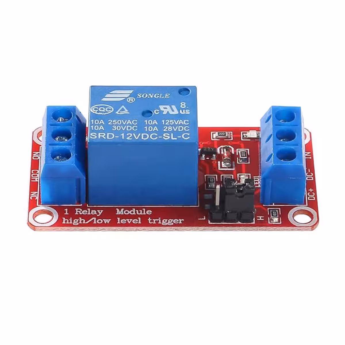 Conjunto 4 peças: Relé de Controle 5V / 12V com Optoacoplador – Módulo 1 Canal, NC/NO, Trigger High/Low, 10A