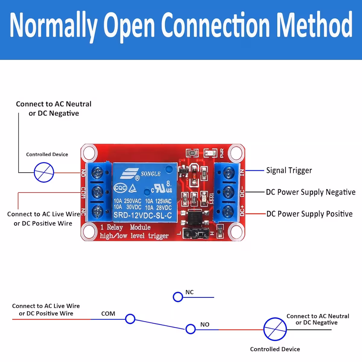 • Use NC/C/NO para controlar a carga AC ou DC.