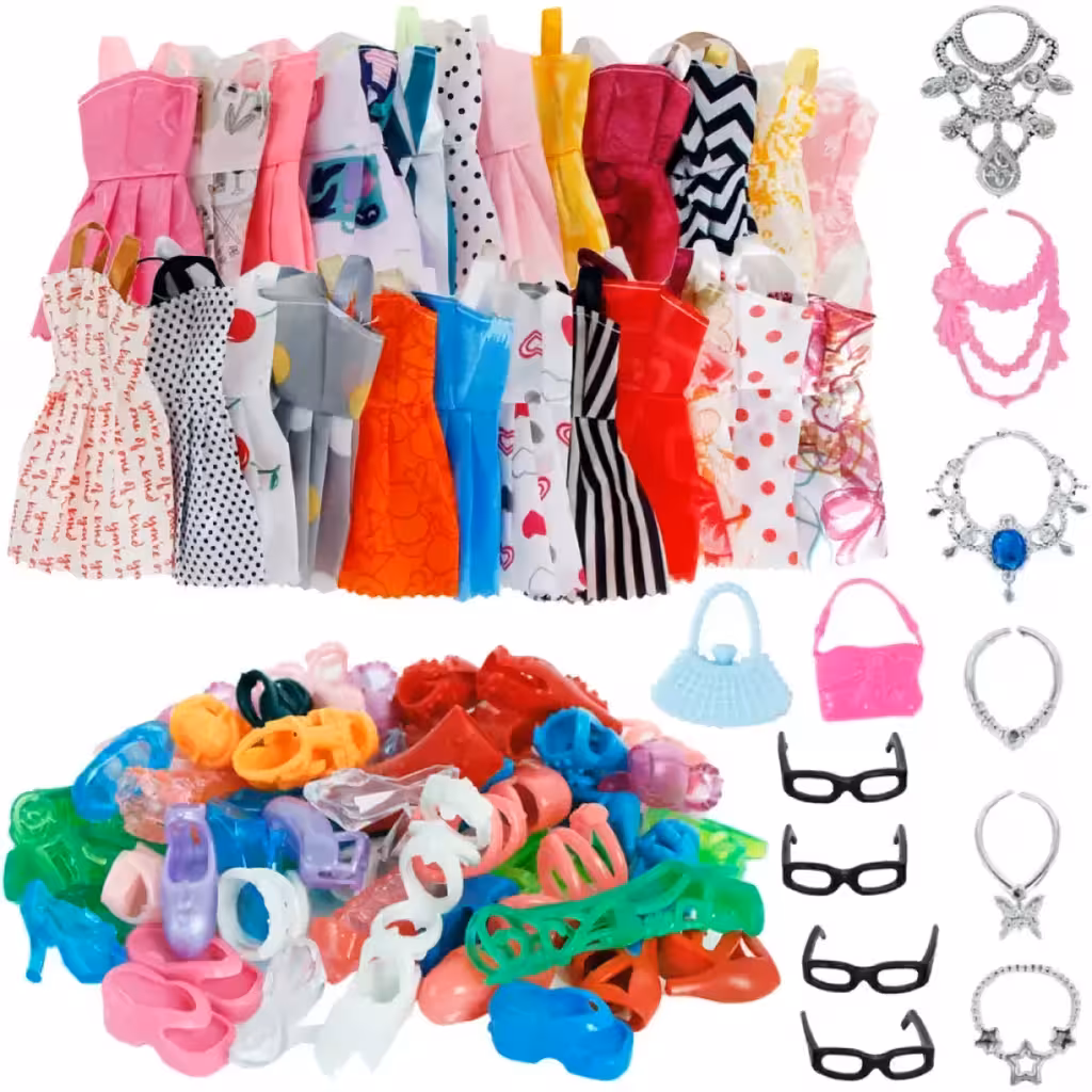 Conjunto completo de roupas, calçados e acessórios para bonecas Barbie, ideal para meninas apaixonadas por moda e brincadeiras criativas.
