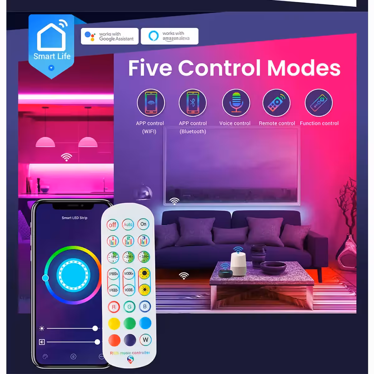 Através do aplicativo, é possível controlar a fita LED remotamente, programar horários automáticos e agrupar várias fitas para controle simultâneo. O controle por voz via Alexa ou Google Assistant garante uma experiência totalmente hands-free.