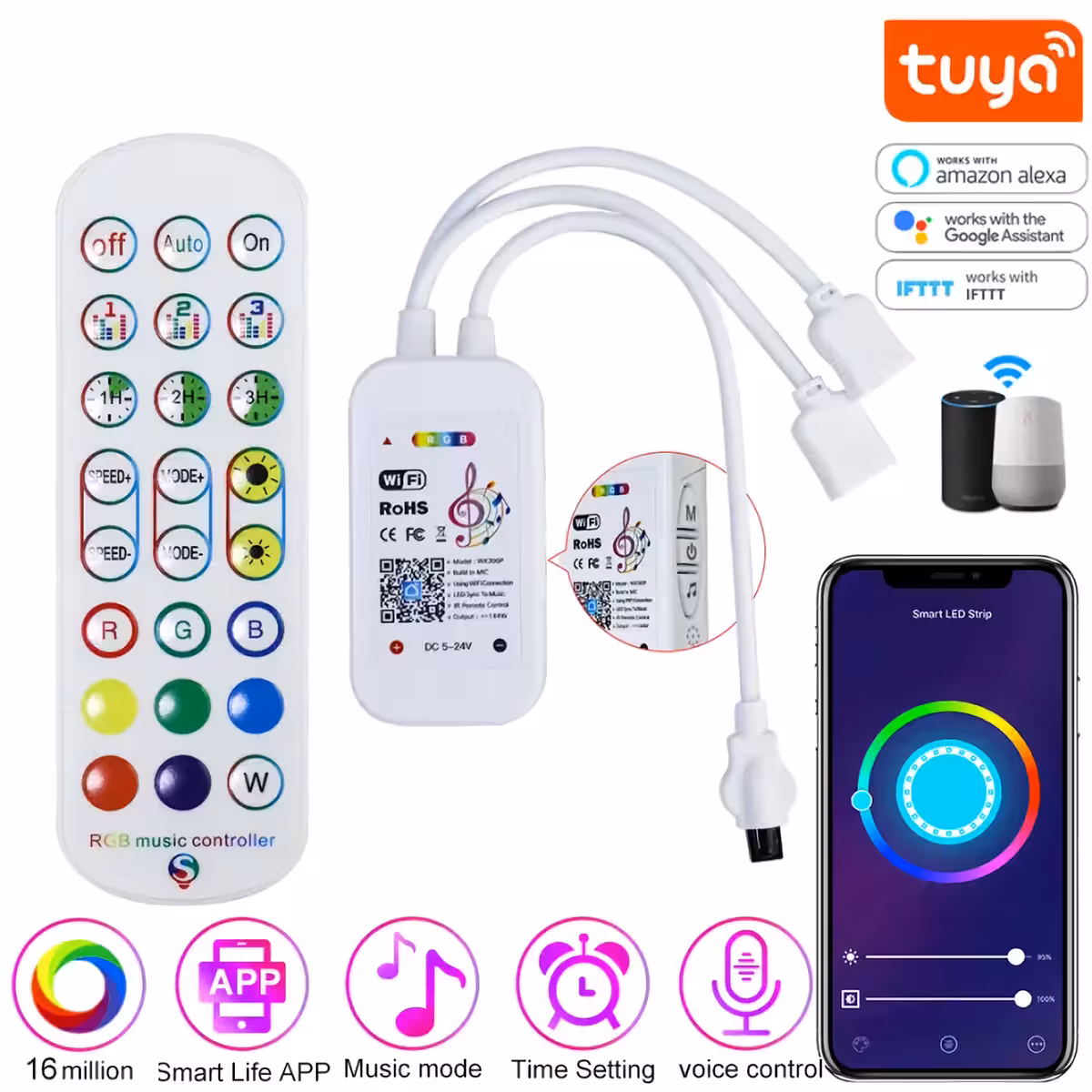 Este controlador inteligente permite controlar a fita LED RGB via WiFi e pelos aplicativos Tuya Smart ou Smart Life, diretamente do smartphone ou tablet. Ajuste facilmente cores, brilho e efeitos, criando a atmosfera ideal para qualquer ocasião.