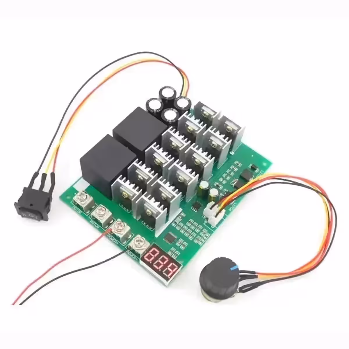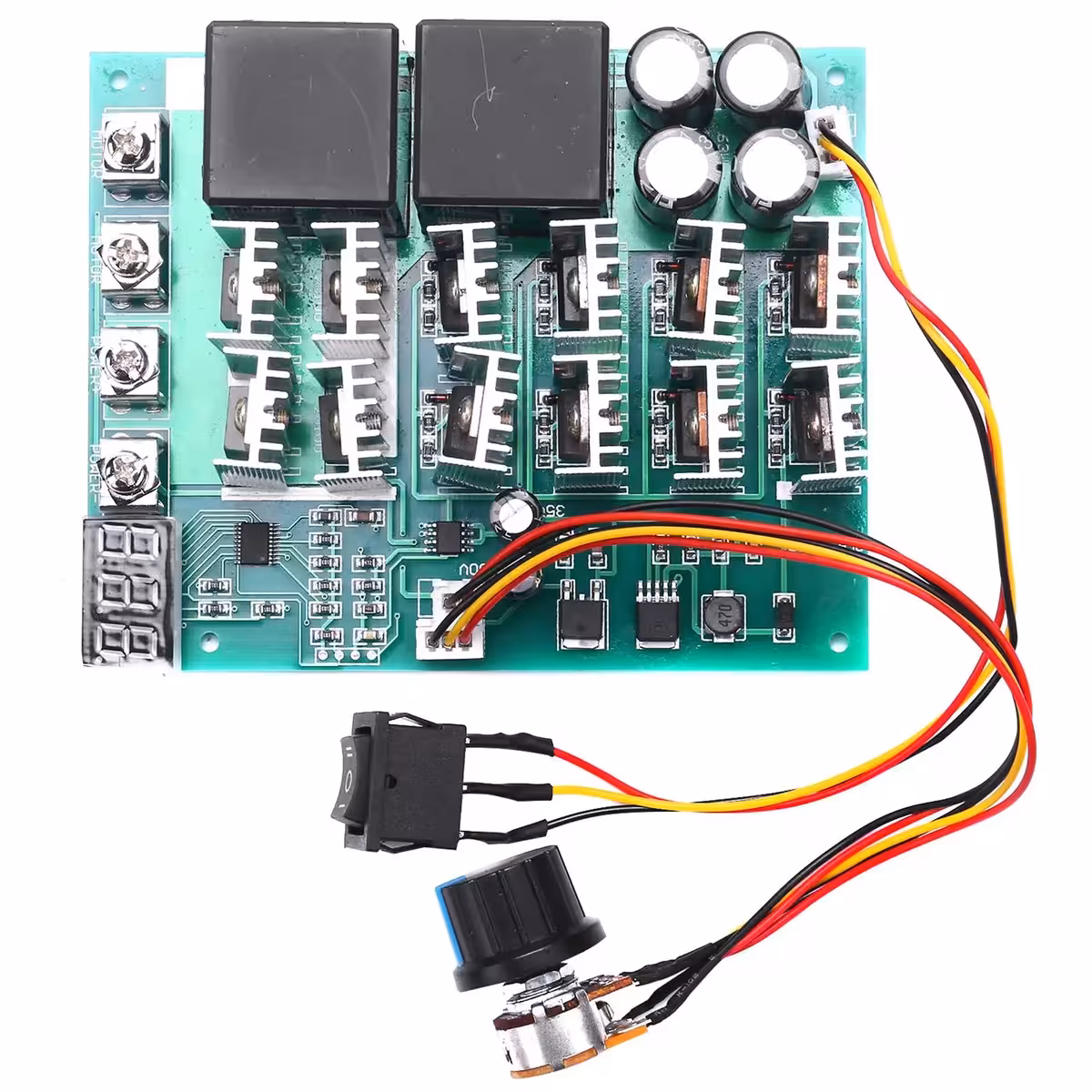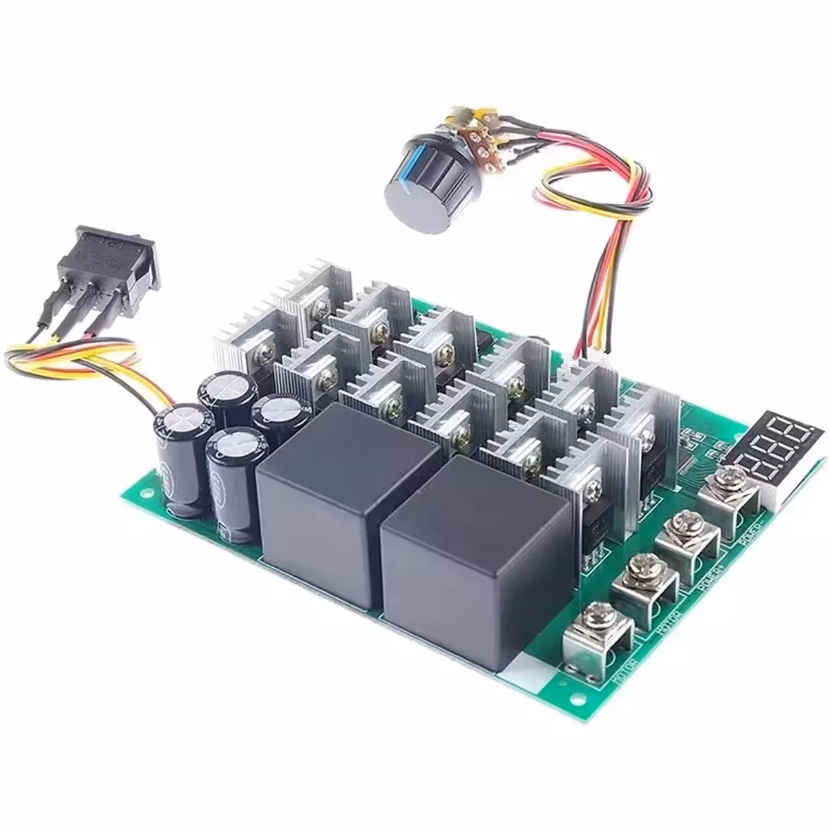 Controlador PWM profissional para controle da rotação de motores elétricos em corrente contínua (DC), ideal para aplicações de alta potência. Oferece ajuste preciso da velocidade via potenciômetro, função de inversão de sentido de rotação e display digital da rotação (0–100%). Compatível com tensões de entrada entre 10V e 55V e correntes de até 100A (60A contínuo).
