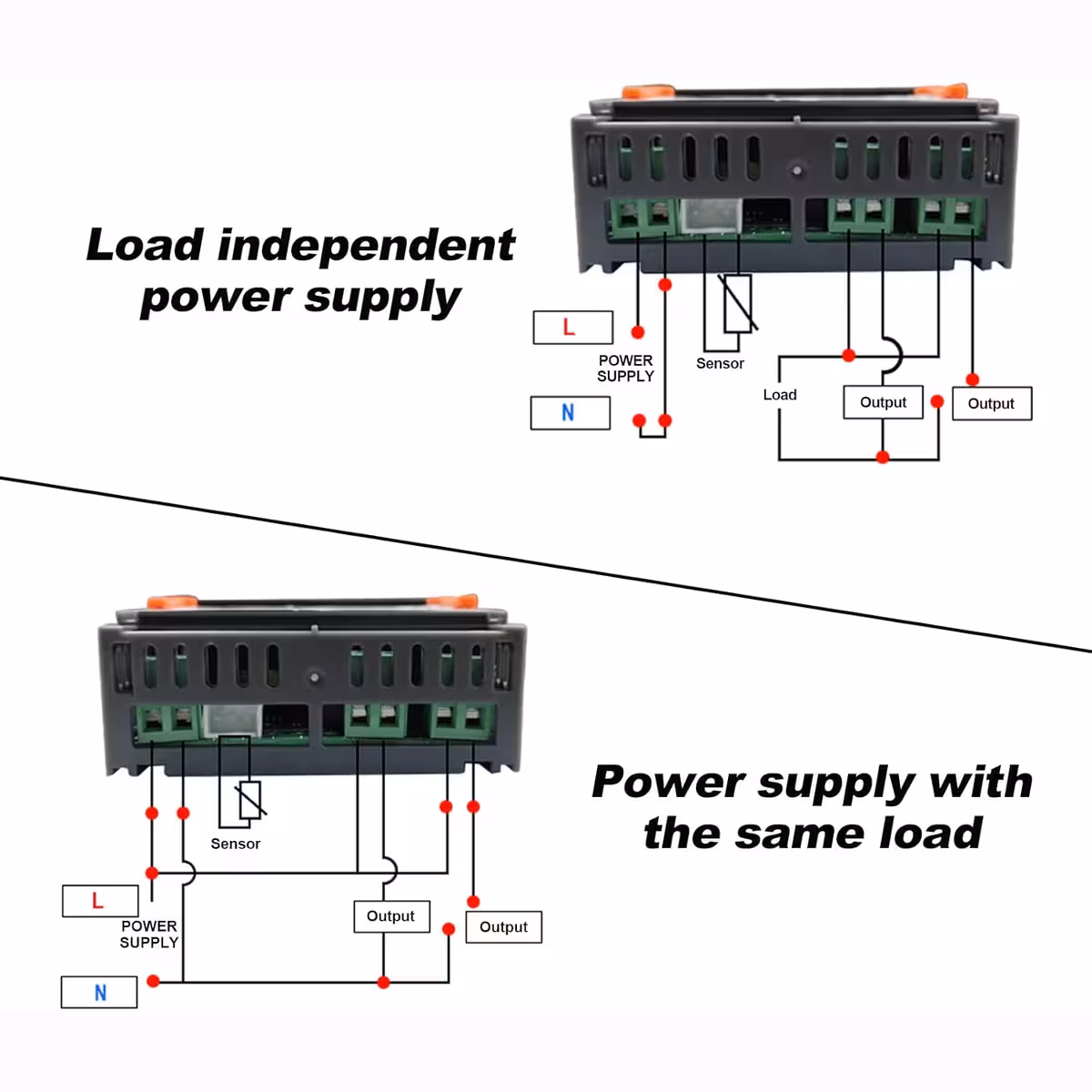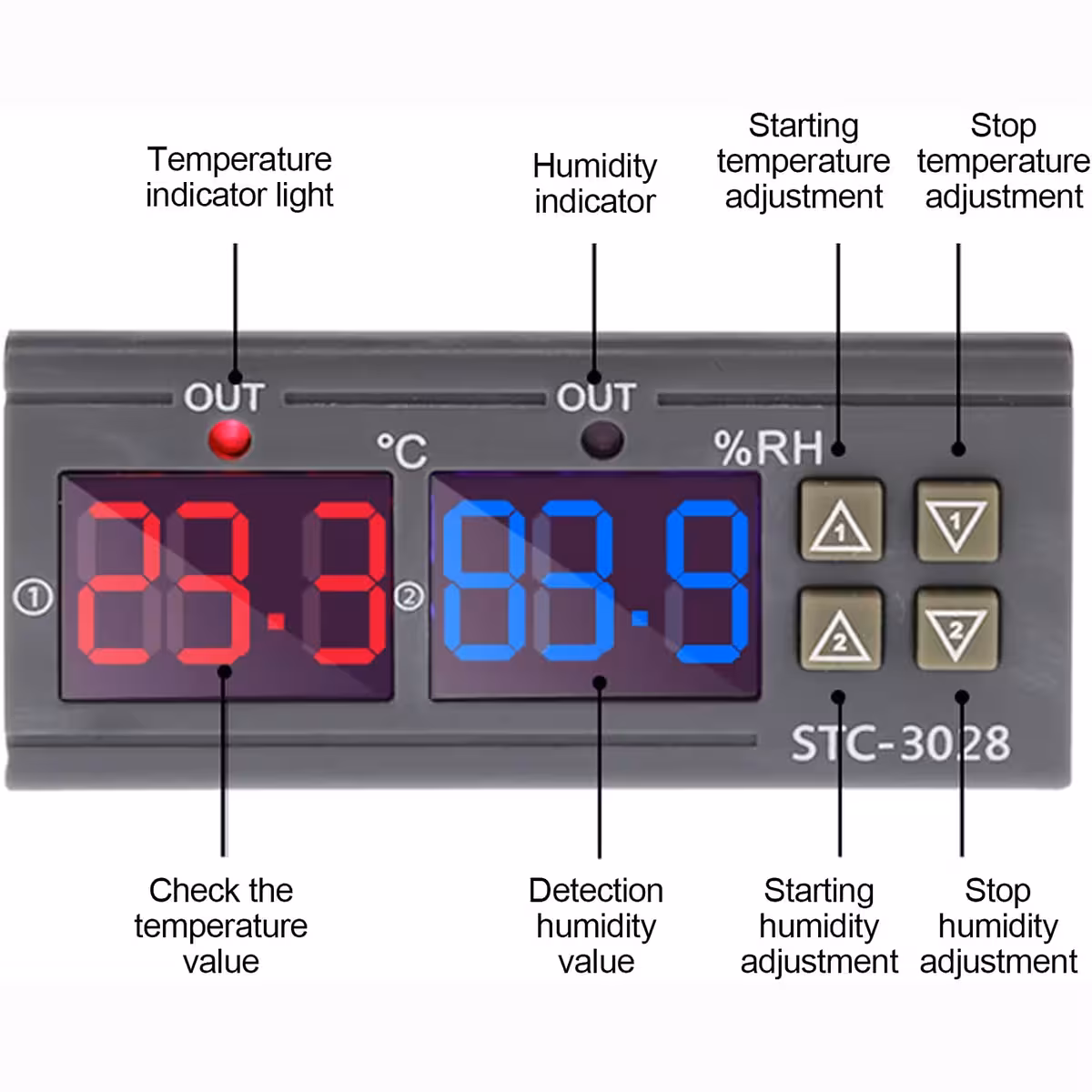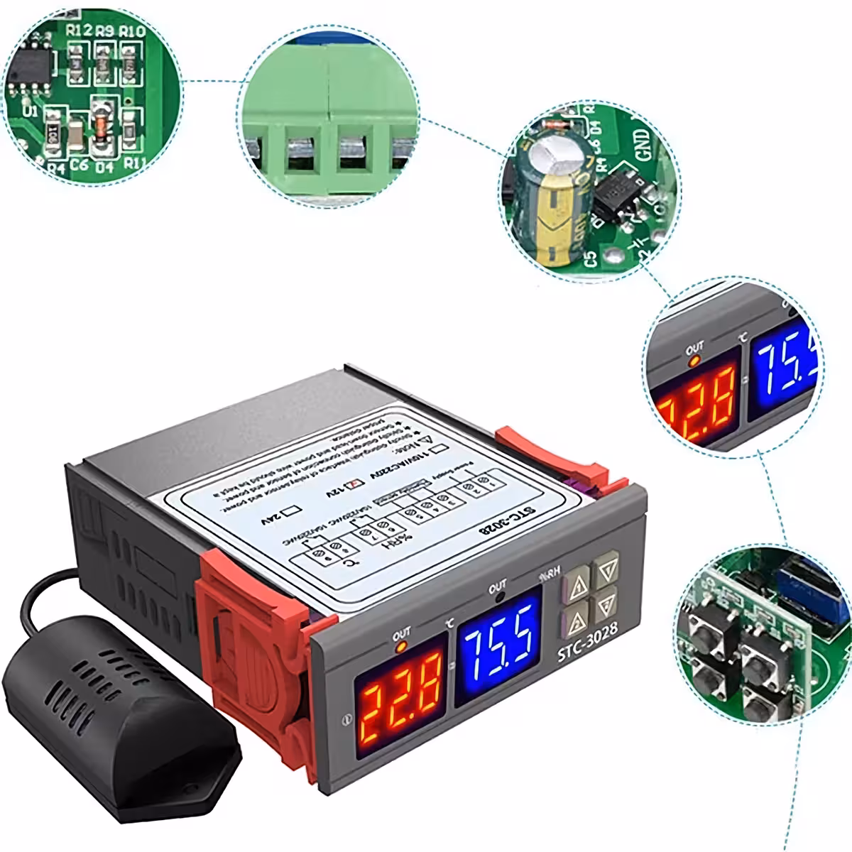 Este controlador eletrônico multifuncional STC-3028 permite monitorar e regular automaticamente a temperatura e a umidade em diversas aplicações domésticas ou industriais. Equipado com dois displays digitais – vermelho para temperatura e azul para umidade – e duas saídas de relé independentes de 10A cada, este termostato e higrômetro digital é uma solução completa e de fácil configuração.