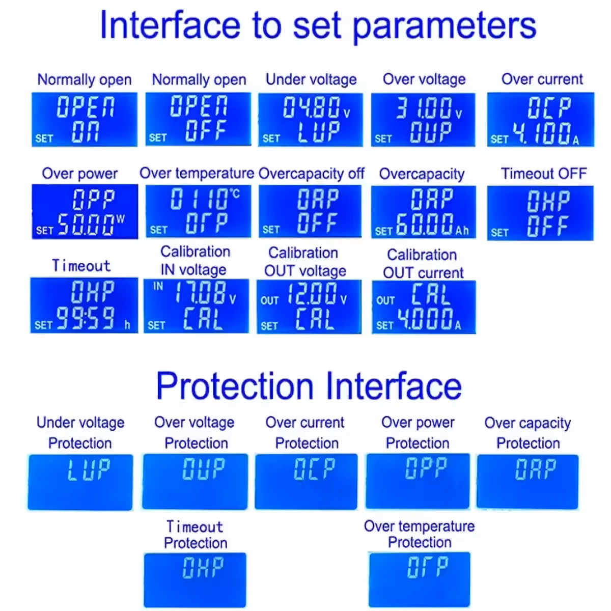 - Configuração de proteções e limites: Pressione longamente U/I para entrar no menu de parâmetros das proteções. Use SW para selecionar a proteção desejada: LUP (subtensão), OUP (sobretensão), OCP (sobrecorrente), OPP (sobrepotência), OAP (capacidade excessiva), OHP (atraso de expiração), OTP (sobreaquecimento). Ajuste os limites e ative/desative as proteções conforme necessário.