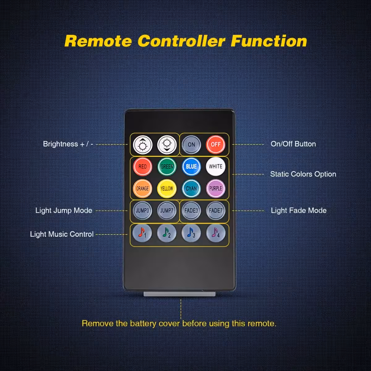 - Controle remoto com 8 cores SMD RGB e opções de ajuste de brilho.