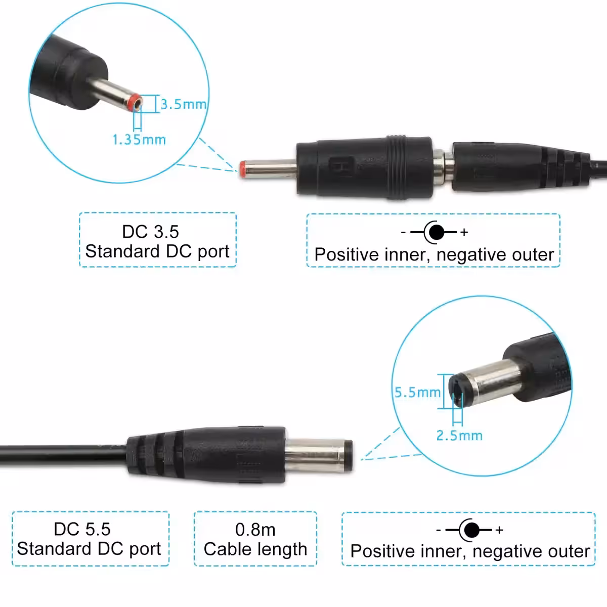 DC 5,5 x 2,5 mm (inclui também adaptador DC 3,5 x 1,35 mm + fêmea 5,5 x 2,5 mm)