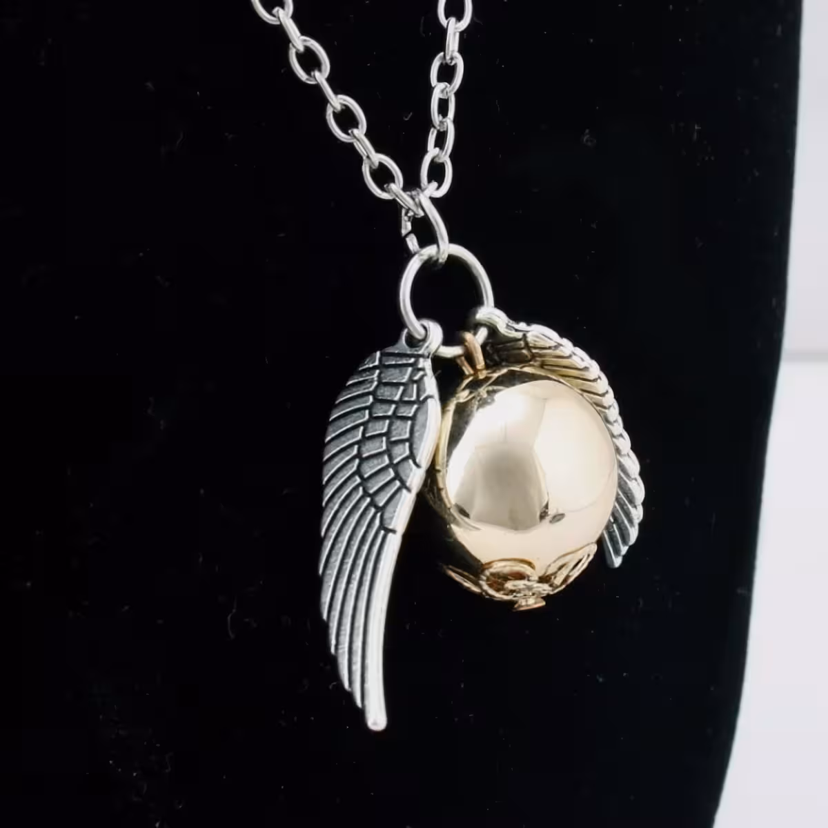 Este pingente com tema Harry Potter representa a bola de Quadribol “Golden Snitch”, com um design elegante que inclui a asa de anjo, simbolizando liberdade e magia.