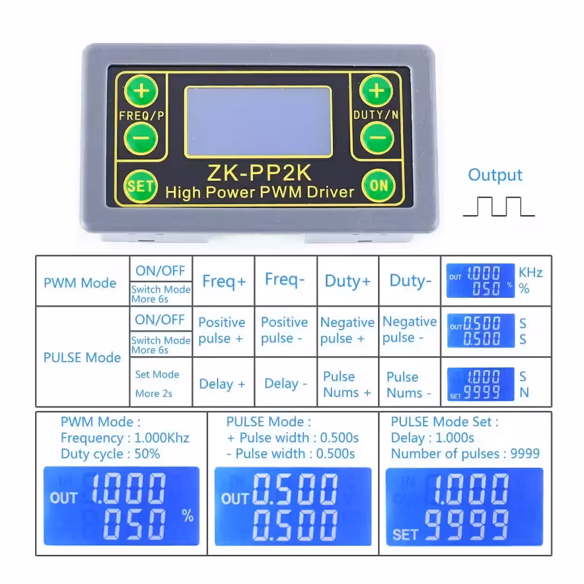 Os botões P+ e P- são usados para definir o tempo do pulso positivo na primeira linha (0,000s a 9999s).