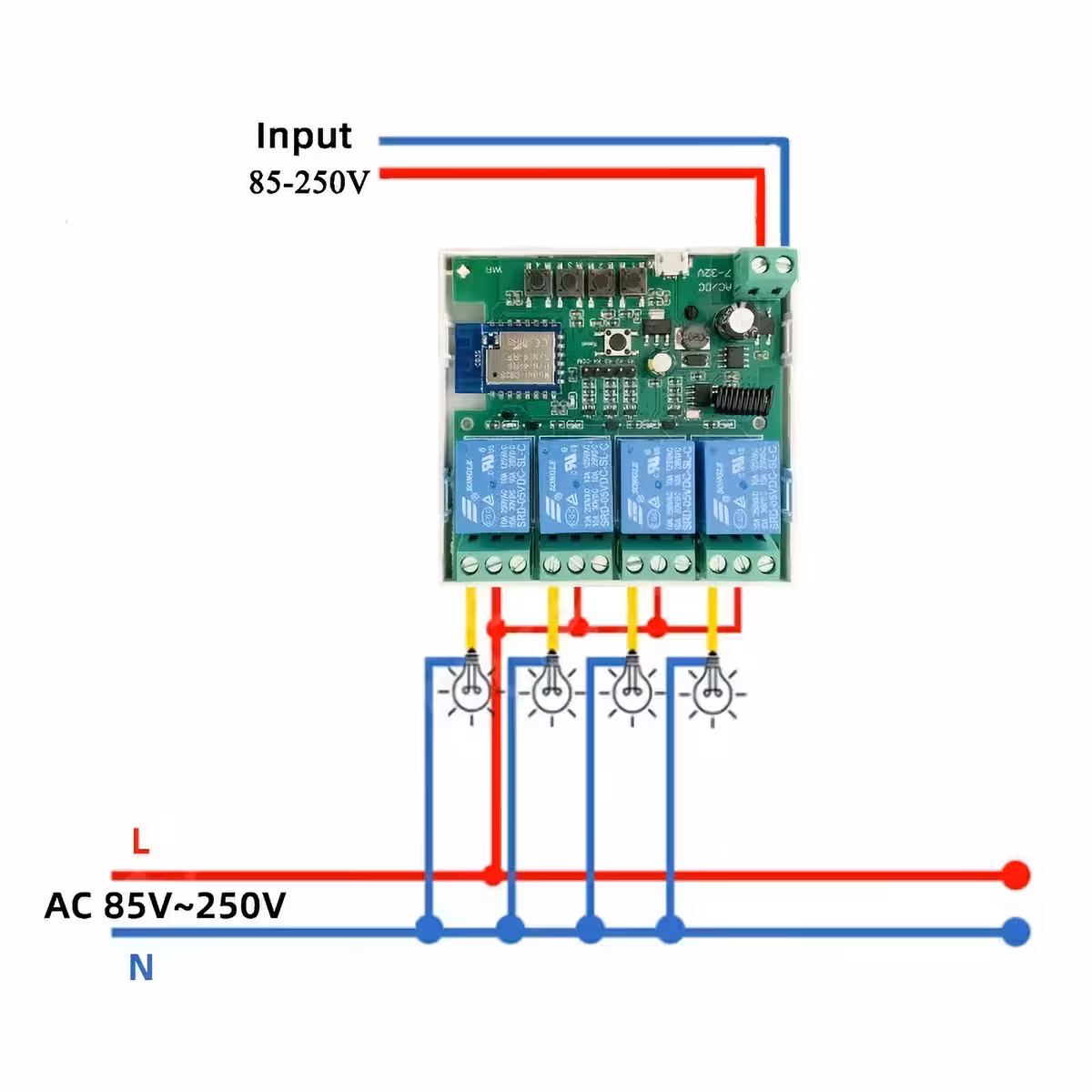 Este relé WiFi inteligente de 4 canais permite o controle wireless de aparelhos elétricos, seja remotamente pelo aplicativo Tuya / Smart Life, ou por comando de voz com Amazon Alexa ou Google Home. É ideal para automação de portas, iluminação, sistemas de aquecimento ou motores elétricos.