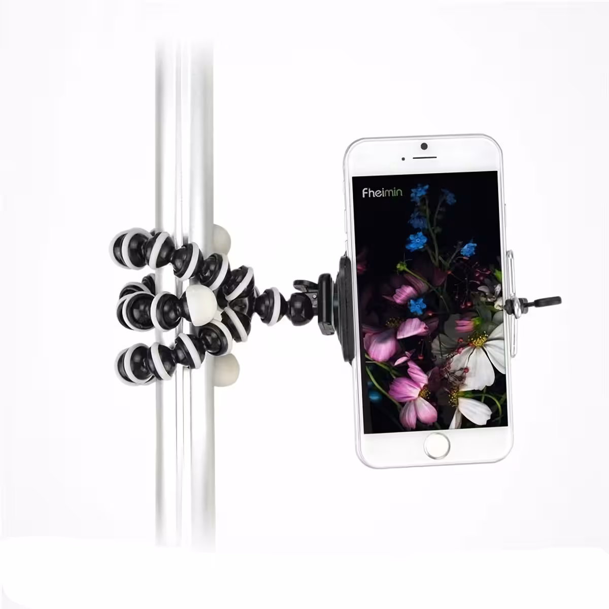 As pernas são compostas por esferas metálicas revestidas em borracha, totalmente flexíveis e giratórias em 360°, permitindo a montagem em superfícies irregulares ou objetos como barras, tubos, galhos, etc.